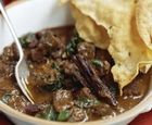 Meat: in a large skillet heat 1/4 C of oil. Add onion and cook till translucent. Add garlic and lamb, browning lamb. Add water, salt, cayenne, and cumin. Simmer on low heat, covered, for 1 1/2 hours. Rice: in a large saucepan, cook rice for 5 minutes in remaining 1/4 C oil, stirring frequently. Add water and bring to a boil. Cover loosely, reduce heat, and simmer 30 minutes or so till rice is tender and most or all of the water is absorbed. Assembly: add spinach and cilantro to lamb and cook 10 more minutes. Turn rice onto a serving bowl and spoon a little stew over the top. Serve remaining stew in another serving bowl. Serve with Naan. |
