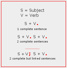 Remember: a semicolon connects two related sentences.Think of it as a combination of a period and a comma. Notice the mark has one of each—top & bottom.