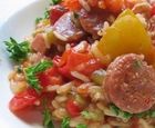 Cajun-Creole Entree Jambalaya Jambalaya, a spicy Creole meat and vegetable stew. One way it differs from Gumbo is that rice is cooked in the stew, not served along side, as in Gumbo. In a heavy pot, saute the sausage till brown. Remove sausage and set aside. Pour off most of the fat. In the same pot, saute chopped onion and bell peppers till soft. Add garlic and cook for 4-5 more minutes. Add tomato paste and cook, stirring till paste caramelizes (darkens to brown). Add all the spices and seasonings to the pot, stirring to blend. Stir in water or broth, canned tomatoes with the juice, and uncooked rice. Bring to a boil and reduce to a simmer. Cover and simmer for 20-25 minutes till rice is done and stew begins to thicken. Add sausage and peeled shrimp and cook for 5-10 minutes more, till sausage is warmed through and shrimp is just cooked. Serve hot with crusty bread. |