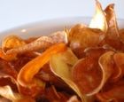 Prep: Use a mandolin (or a very sharp knife) to slice the potatoes 1/16" or less—to the thinness of a commercial potato chip. Pat dry. Deep fried: If you don't have a deep fryer, pour 2" of oil into a large saucepan. Heat oil to 375 degrees. Fry the potato slices in batches until crispy, turning with tongs. Allow the oil to return to 375 between batches. Quickly drain on paper towels, then while still warm toss them in a bowl with salt and serve.* Oven baked: Preheat oven to 450. Toss potato slices with 2-3 T oil. Arrange slices in a single layer on a cookie sheet. Sprinkle with salt. Bake 10 minutes, flip over with a spatula. Bake 10 more minutes until crispy. Pour into a bowl and serve.* Serve with a bowl of our Green Crry Dip or Tomato Mango Salsa. *While still warm, try sprinkling with paprika or a mixture of sugar, cinnamon and nutmeg (just a pinch). |