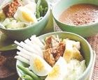 Indonesian Appetizer Vegetables w/ Peanut Sauce A classic Indonesian dish of cooked and raw vegetables. served with a delicious, spicy peanut sauce.