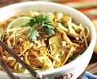 This dish cooks quickly, so make sure everything is prepared ahead of time. You don’t want the Pad Thai to overcook while you make the sauce or chop nuts. Tamarind sauce: in a saucepan combine tamarind paste with 1/4 C warm water. Add sugar and shrimp paste. Heat to melt and blend the ingredients. Begin adding chili pepper powder. Add 1/2 tsp. chili powder (or more according to your taste). Set the sauce aside. Prep: soak noodles in warm water 40-60 min. till malleable but not too tender. Drain well. Stir-Fry: Heat oil in wok or large skillet till almost smoking. Add chicken and stir-fry quickly for 1 minute. Add tofu and garlic, stirring for 2 more minutes. Add tamarind sauce, bit at a time, stirring and blending ingredients. Next add shrimp, stirring 1 minute. Keep adding sauce. Move everything over to side and add eggs, letting them cook for 30 seconds; then toss eggs together with mixture. Add drained noodles to skillet or wok. Add more sauce, stirring to blend. Add sprouts, 1/2 the peanuts, stirring all the time. If it’s too dry, add more sauce, oil, or even a bit of water. Cook till noodles are slightly al dente. Serve: turn Pad Thai into a serving dish, top with remaining peanuts, scallions, cilantro, and lime quarters. Serve immediately. * Thin rice noodles make it difficult to cook this in large batches. So for more than four people, don't double the recipe—instead, cook two separate batches.